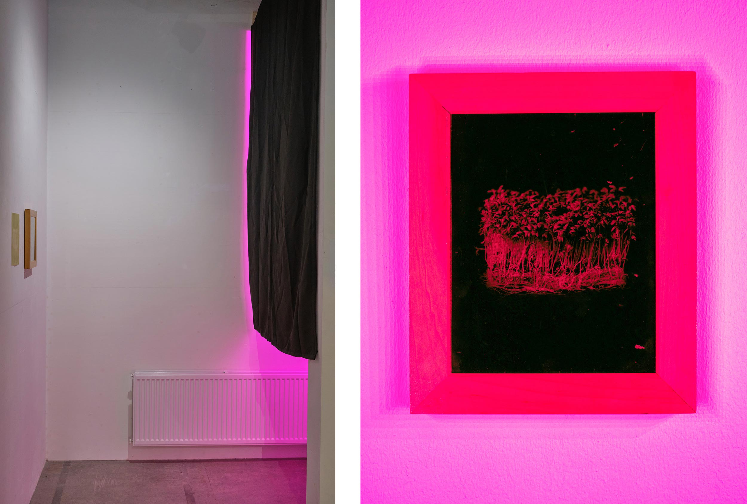 In the background of the simulated pink room, an audio recording of night-shift labourers plays. Their voices recount the working conditions within the ethereal glow that forces plants to grow through the night, producing chlorophyll and, ultimately, a market-ready product.